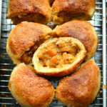 Once the dough has risen, punch it down and divide it into equal pieces. Roll each piece into rounds and flatten them out. Place a spoonful of curry filling in the center of each round, fold over to seal tightly.