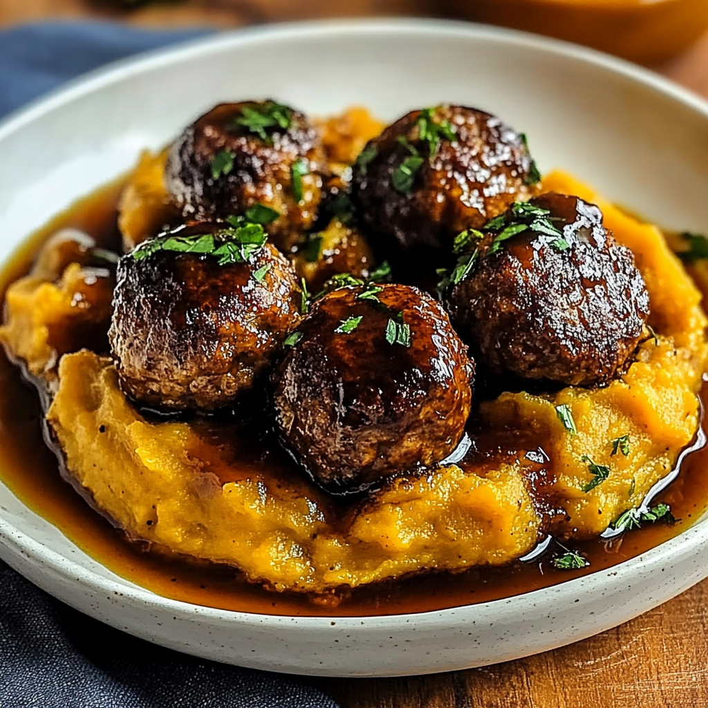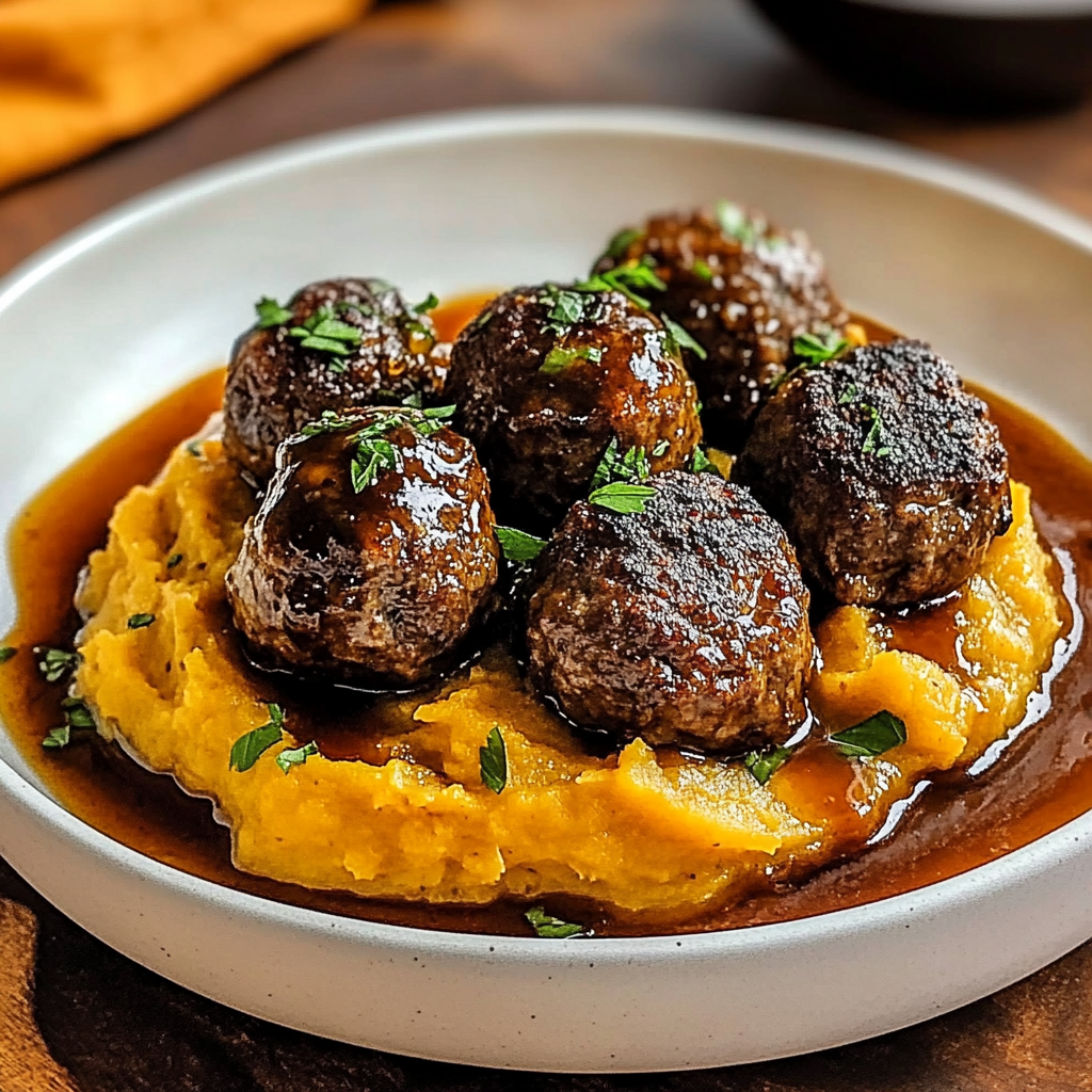 Enjoy Irresistible Beef Meatballs with Sweet Potato Mash & Apple Cider Sauce