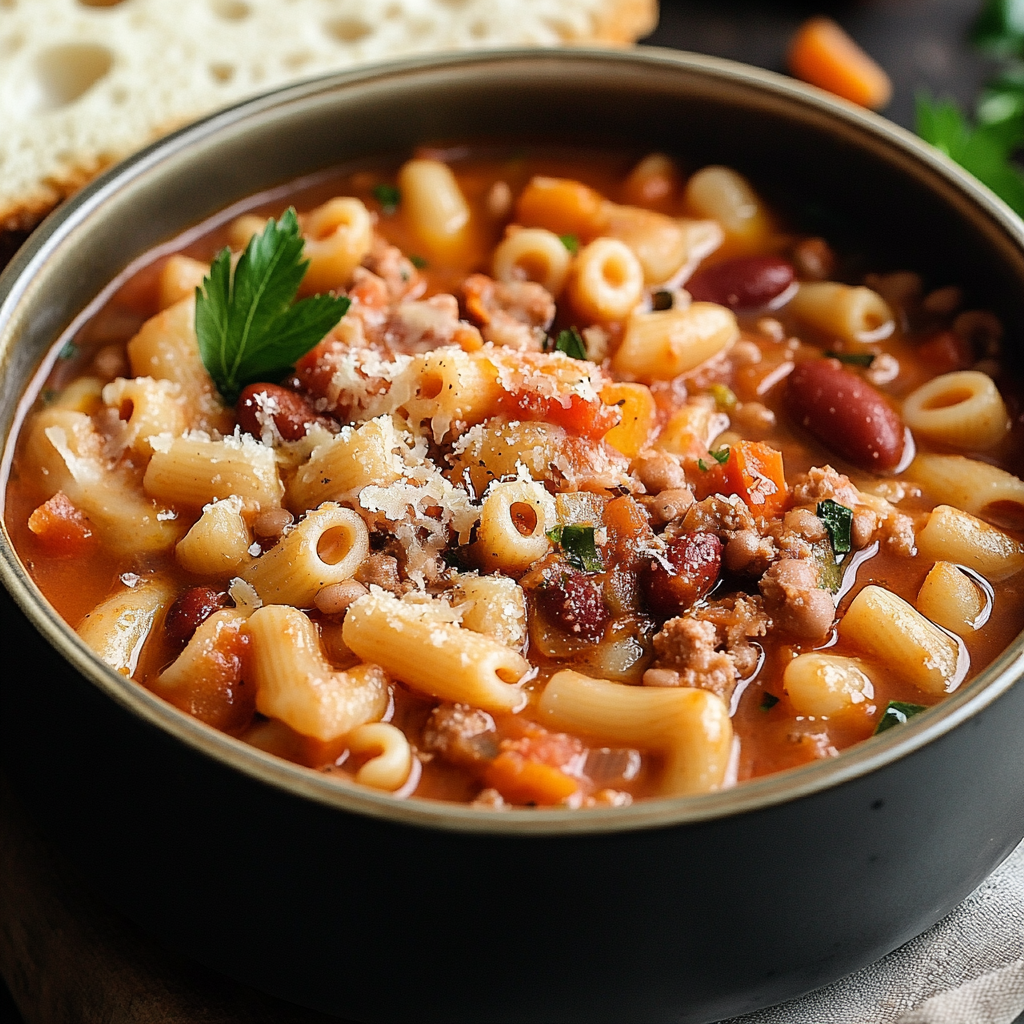 A hearty Italian-style soup with pasta, beans, beef, and vegetables simmered in a rich tomato broth—cozy, filling, and easy to make at home.